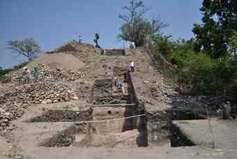 A funerary chamber with annex was located inside one of the earliest structures of Mound 11; the pyramid might have been 6 or 7 meters high, and had a clay staircase and a temple atop.
