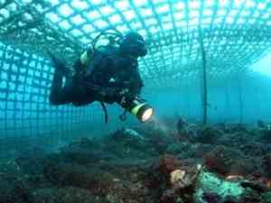 A steel mesh cage the size of a volleyball field shields the wreck, which is about 67 feet long and 35 feet wide. At least 700 amphoras are visible above the seabed.