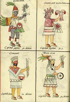 What we know about the Aztecs comes from first-hand accounts primarily from post-Conquest documentation. These codices are more like books, illustrated to a written text. Certainly, one of the outstanding displays in the Getty exhibit is the 'Historia general de las cosas de Nueva Espa'a' (1575-1577), written by the Franciscan friar Bernardino de Sahag'n. Known familiarly as the Florentine Codex (1559-67), this chronicle of Aztec history and culture has traveled to the Getty from its home in the Biblioteca Medicea Laurenziana in Florence for the first time in 400 years. The book contains pictures painted by the sons of Aztec aristocrats, explained on the left side of the page in Spanish and on the right in Nahuatl (the language of the Aztec).