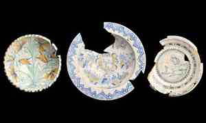 The bowls, which go on display today at the Museum of London after months of conservation work piecing them together, are rare survivals from a ceramics works only a few hundred yards away, beside Southwark cathedral. Each is a unique piece, demonstrating the varying ambitions and skills of the pottery painters of the day. One is an Islamic-inspired tulip design; another, marking the marriage of NT to ET in 1674, imitates Chinese porcelain; and the last so ineptly attempts a blue and white Dutch painting that museum staff have named it "boy with colander on head tormenting meerkat with stick".