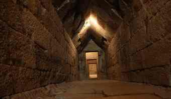 Amazed, clutching our tickets, we go back and unlock the gates. The feeling is fascinating. We find ourselves in a narrow corridor, built from huge stone slabs, under a triangular dome. It leads us into two consecutive antechambers and a main chamber containing a stone bed and urns. Everything is perfectly preserved and untouched. We carefully lock the iron gates and tell the next tourists where they should pay their entrance fee.