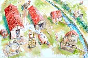 The industrial area comprised a series of large timber buildings, mostly on the north side of a beck, which powered the mill.