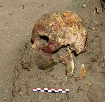 In the journal, the team reports on the burial of a man in his twenties, found with four pots, five copper ornaments in his mouth and his skull streaked with red cinnabar. Study revealed, "the skeleton was incomplete and had been disturbed prior to excavation: the left forearm and lower legs were entirely missing; and the right humerus had been put back on the wrong side. In all likelihood, these disturbances were caused by the Moche reopening the grave, and not by tomb plunderers (Huaqueros) who would have removed the grave goods to sell, and not bothered with the skeleton."