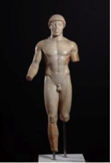 On loan to the Getty through April 19, the artwork, created by an unknown artist, is a rare example of an early classical marble statue called a "kouros," or idealized nude young man. It is being displayed in the Getty Villa's gallery devoted to images of athletes and athletic competition.
