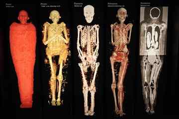 The exhibit shows how technology like CT scans and X-rays examine human teeth, bone and genitals to discover age, physical condition and social status.