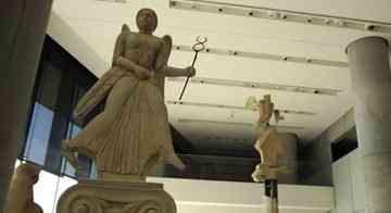 The remnants of the 4.68-metre monument have been affixed to a metal column that holds the various parts in place. It is built so that additional fragments might be attached if they are found. It is on display in the museum’s Archaic Monuments section.