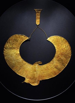 Included in the exhibit are 51 pieces from Tut's tomb, including the gold covers for the mummy's fingers and toes. They, like the other amulets found in the wrappings, were thought to provide protection. Among the most spectacular is the triple-scarab pectoral necklace that rested on his chest. Tut was buried with six pairs of earrings, and 150 items adorned his body.