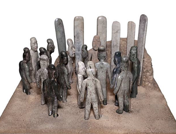 One of the most intriguing pieces in the show is "Offering 4," a gathering of 16 jadeite and serpentine figurines, about 6 inches tall, engaged in a some type of ceremonial ritual in front of six pillar-like celts, or votive axes. An offering to the gods, this mysterious piece was discovered by Mexican archaeologist Eduardo Contreras at La Venta in 1955. Nothing like it had ever been unearthed.
