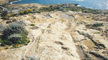 The cart-ruts at Dwejra are located on the cliff which separates the inland sea from the open sea. They consist of a single pair running for an approximate length of 350 metres, forking out into two separate pairs at mid point, only to converge again into a single pair.
