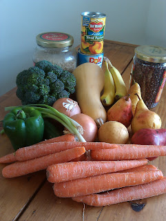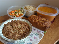 To make the most of your time, pull all ingredients for all recipes out of the cupboards and the refrigerator and stack them together. Collect all necessary pots, pans, measuring cups, knives, and utensils and stack them on the stove and counter—wherever you’ll need them. Start by getting the brown rice heating. While rice is coming to a boil, pre-heat the oven and then mix the pumpkin-banana bread batter. By now, the rice will have boiled and should simmer away on its own for the next 45 minutes. Pour the bread batter into a pan and start baking the loaf. It will take close to an hour. In the meantime, wash and chop all the vegetables and fruits needed for the soup, crisp, and a week’s worth of all-purpose chopped veggies. As you chop, sort the produce by recipe into the plastic containers in which you’ll store them (or cooking pan for the crisp). Once you’ve got 4-6 cups of chopped mixed veggies, store them in the fridge. Now, start the soup cooking on the stove top. Once the soup is simmering, the rice should be done. Assemble the crisp and its crumb topping while the bread finishes baking. The bread should be just about ready to come out of the oven when the crisp is ready to go in. While the bread and rice cool, the soup stews, and the crisp bakes, bring the pressure cooker up to heat for the adzuki beans. The soup will likely be done soon, and you can allow it to cool on the counter for a few minutes before pureeing it in a blender. Finally, the crisp and the pressure cooked beans will be done around the same time.