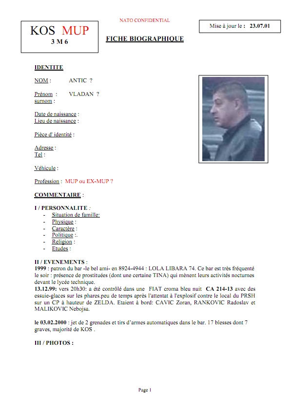 Dokumenti konfidencial i NATO-s e ka evidentuar Vladan Antiqin si një kriminel tipik, me përvojë të të kultivuar edhe në kuadër të strukturave të MUP-it të Serbisë, që funksionoi në Kosovë edhe pas vitit 1999. Antiq ishte pjesë e pandarë e strukturave të krimit të organizuar në veri.