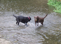 Although Wiggle was already in the water, Sofy managed to get to the ball first: