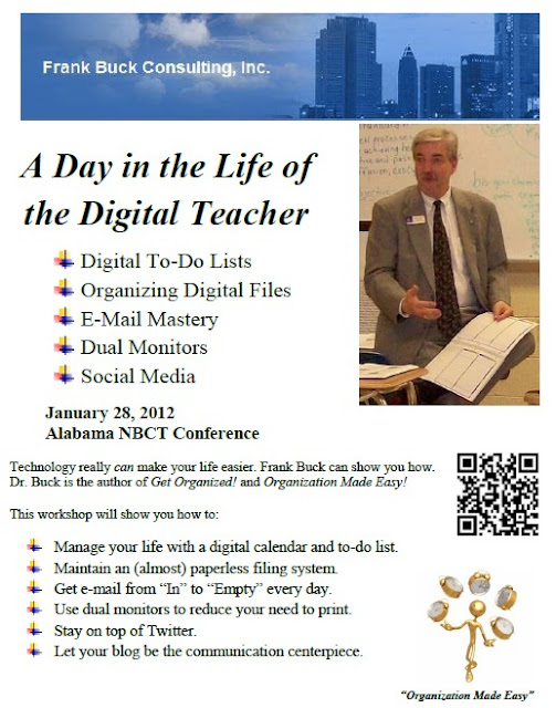 Our annual conference, which will be held at Spain Park High School on January 28, 2012, will soon be upon us. After evaluating the online survey, the overwhelming number one topic requested was "staying organized in a digital world." We are fortunate to have Dr. Frank Buck, the get-organized guru, presenting two different sessions. Here is a preview of one of the sessions that he will be presenting. I'm sure none of you will want to miss it. Be sure to mark your calendar now.