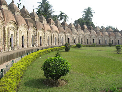 The adjoining Rajbari complex is a cluster of exquisitely crafted structures - the speciality of the temples is their diversity - showcasing the various kinds of Bengal temple architecture. There is the chala architecture, multiple ratna, ridged deul (known as the Birbhum-Burdwan type), flat roofed, replica of hill, rashmancha and so on. Its astonishing beauty of exquisite terracotta work is a feast for the eyes.