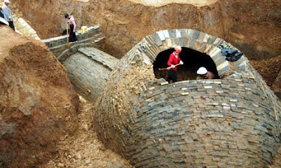 | Workers excavate a 1,700-year old brick tomb in China's Jiangsu province. But often thieves get there first, sometimes just bulldozing their way in [Credit: AP] |