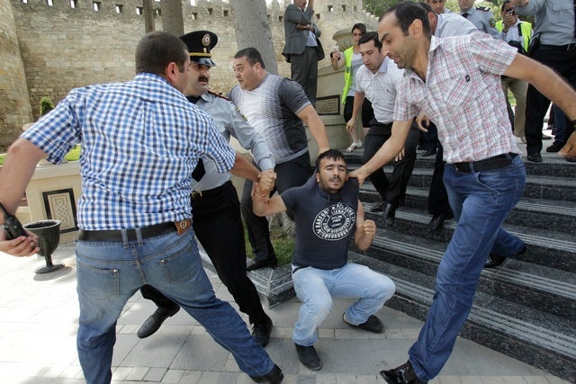 At about 1 p.m., a handful of opposition supporters gathered outside Ictimai’s offices in Baku, the capital, and began to unroll posters with protest slogans. Without warning, police in uniforms and civilian clothes immediately moved in on the demonstrators, restraining them violently, including pinning their arms and roughing them up. Officers then shoved the protesters into waiting police cars and drove them away.