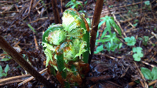Run cool water gently over the fiddleheads to clean, rubbing the brown papery coating off with your finger. The photo below shows the densely curled fiddleheads - perfect for eating.