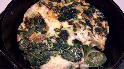 Heat burner to medium. In a single sized skillet, melt butter until bubbly. Saute the washed and prepared fiddleheads until almost tender. Add dandelion greens and cook until wilted, stirring often. Add fireweed shoots and stir. Crack eggs over the fiddleheads and greens, break the yolks, then cook until the underside is firm and lightly browned. Flip frittata and cook until done. Sprinkle with sea salt.