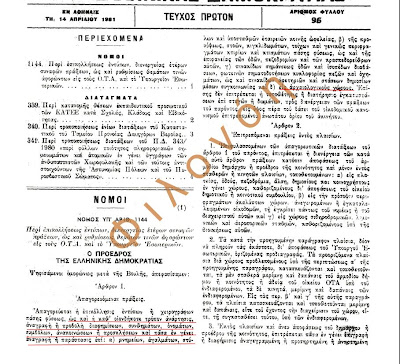 Στήν εἰκόνα τοῦ ἄρθρου, βλέπετε τό συγκεκριμένο ΦΕΚ, διά τοῦ λόγου τό ἀληθές.