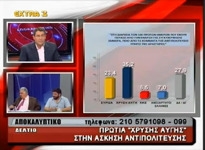 Στην εκπομπή του extra3, "αποκαλυπτικό δελτίο" φιλοξενήθηκε η μεγάλη δημοσκόπηση της ομάδας του καθηγητή ΠΑΝΑ με αφορμή την συμπλήρωση 100 ημερών από την ανάληψη καθηκόντων της κυβέρνησης του τρίο στούτζες. Το ερώτημα ήταν το εξής:... "Στην διάρκεια των 100 ημερών που έχουν περάσει από την έναρξη της συγκυβέρνησης Σαμαρά ποιο κόμμα πιστεύετε πως κάνει αντιπολίτευση;" ΧΡΥΣΗ ΑΥΓΗ 35,2% ΣΥΡΙΖΑ 23,4% ΑΝΕΛ 7% ΚΚΕ 6,5% πηγη