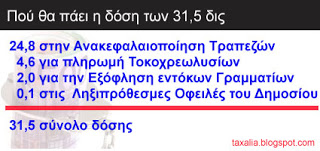 Με τα υπόλοιπα 100 εκατ. περίπου θα πρέπει να διευθετηθούν ληξιπρόθεσμες οφειλές του Δημοσίου, οι «τρύπες» της Τοπικής Αυτοδιοίκησης και του ΕΟΠΥΥ και το πρωτογενές έλλειμμα του 2012! Η δόση των 31,5 δισ. ουδεμία σχέση έχει με την ενίσχυση της πραγματικής οικονομίας, αλλά κατευθύνεται αποκλειστικά στο χρηματοπιστωτικό σύστημα και στους δανειστές, είτε με τη μορφή της ανακεφαλαιοποίησης και της αποπληρωμής εντόκων γραμματίων (ελληνικές τράπεζες) είτε για αποπληρωμή τοκοχρεωλυσίων (χώρες-μέλη της Ε.Ε. και ΔΝΤ). * Σύμφωνα με τον γνωστό οικονομικό συντάκτη Γιώργο Δελαστίκ, το ποσό που θα πέσει στην αγορά, δεν είναι 0,1 δις αλλά 0,9 (μικρή η διαφορά, όλοι συμφωνούν ότι η δόση θα πάει στις τράπεζες). taxalia olympia.gr makeleio.gr