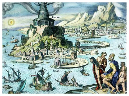 Τόσο πρακτικός και όμορφος, ο 140 μέτρα φάρος στην είσοδο του λιμανιού της Αλεξανδρείας, ξεκίνησε να καθοδηγεί τους ναυτικούς απο το250 π.Χ.περίπου. Μια πυρκαγιά έκανε το φάρο να φέγγει τη νύχτα και ένας καθρέφτης να αντανακλά τις ακτίνες του ήλιου κατά τη διάρκεια της ημέρας, κάποιοι λένε μέχρι 35 μίλια μακριά. Ο φάρος της Αλεξάνδρειας, είναι ένας αρχαίος φάρος, που απεικονίζεται σε αυτό το χρωματισμένο χαρακτικό του Martin Heemskerck. Η αιγυπτιακή πόλη της Αλεξάνδρειας, ένα από τα επτά θαύματα του αρχαίου κόσμου, μπορεί να έχει κατασκευαστεί για να ευθυγραμμιστεί με την ανατολή του ηλίου την ημέρα της γέννησης του Μεγάλου Αλεξάνδρου, διαπιστώνει μια νέα μελέτη. Ο Μακεδόνας βασιλιάς, διέταξε μια αυτοκρατορία που εκτεινόταν από την Ελλάδα στην Αίγυπτο στον Ινδό ποταμό σε αυτό που είναι τώρα η Ινδία, ίδρυσε την πόλη της Αλεξάνδρειας το 331 π.Χ. Η πόλη αργότερα θα γίνει εξαιρετικά ακμάζουσα.