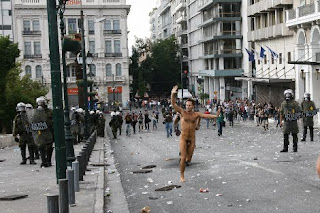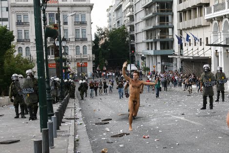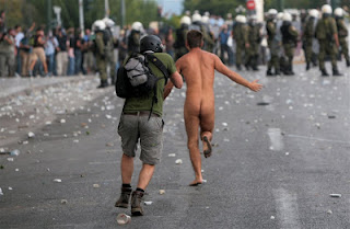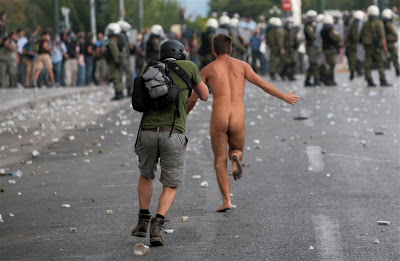 Κατά τη διάρκεια των επεισοδίων ένας ΒΡΕΤΤΑΝΟΣ ΠΡΑΚΤΟΡΑΣ διαδηλωτής βγήκε στην κυριολεξία από τα ρούχα του, αφήνοντας με ανοιχτό το στόμα τους υπόλοιπους συγκεντρωμένους και όχι μόνο. Τον τραβήξαν πρώτα σε βίντεο,τον αφήσαν να τρέξει για να βγούν και οι φωτογραφίες και το κόλπο έγινε... Ενοχοποιεί ο Βρεττανός ναρκομανής πρακτοράκος,τους Έλληνες,ότι είμαστε ΓΕΛΟΙΟΙ!!!!Άρχισε να τρέχει … γυμνός για να διαμαρτυρηθεί και στη συνέχεια συνελήφθη από τους αστυνομικούς.... πηγη