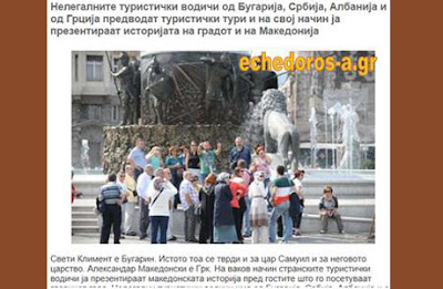 Θα υποχρεωθούν οι τουρίστες να έχουν ξεναγούς Σκοπιανούς! Ξεναγοί από ξένες χώρες στρεβλώνουν τη «μακεδονική» ιστορία, γράφει η σλαβική εφημερίδα των Σκοπίων Νόβα Μακεντόνια. «Ο Άγιος Κλήμης ήταν Βούλγαρος. Το ίδιο λένε και για το βασιλιά Σαμουήλ και το βασίλειό του. Ο Μέγας Αλέξανδρος ήταν Έλληνας. Έτσι οι ξένοι ξεναγοί παρουσιάζουν στους τουρίστες, την ιστορία και τα αγάλματα που επισκέπτονται την πρωτεύουσα, Σκόπια. Οι παράνομοι αυτοί ξεναγοί είναι από τη Βουλγαρία, τη Σερβία, την Αλβανία και την Ελλάδα, γράφει η εφημερίδα και υποστηρίζει ότι έρχονται συχνά με ομάδες τουριστών. «Αυτοί δημιουργούν μια ανεπανόρθωτη βλάβη στον πολιτισμό και την ταυτότητα της χώρας σε αυτήν την δύσκολη ιστορική καμπή», λένε οι ταξιδιωτικοί πράκτορες. Ζητούν την προστασία του επαγγέλματος των τοπικών ξεναγών οι οποίοι έχουν λάβει άδεια και προτείνονται από την τουριστική αστυνομία... «Έχουμε δημιουργήσει τα μνημεία «Σκόπια 2014» και τα παρουσιάζουν υπέρ τους. Έχουμε πολλούς νέους πτυχιούχους ταξιδιωτικούς οδηγούς έτσι ώστε να μην μένουμε απαθείς, ενώ οι άλλοι να λειτουργούν παράνομα. Στη χώρα υπάρχουν πάνω από 300 ταξιδιωτικοί οδηγοί, και δεν χρειάζονται οι ξένοι να κάνουν τη δουλειά μας», είπε ο Μπράνκο Μποσίλκοφ. Ο ίδιος που είναι πρόεδρος του συλλόγου των Ξεναγών στα Σκόπια, είπε ότι πρέπει να ελέγχονται οι συνοδοί των τουριστών στα Σκόπια. Μια παρόμοια επιθεώρηση έγινε στην Οχρίδα, και είναι αναγκαίο να γίνει και στην πόλη των Σκοπίων, όπου έρχονται πολλοί ξένοι τουρίστες. Οι αρχές της πόλης με τη σειρά τους, δήλωσαν ότι θα εργαστούν για τη δημιουργία του ελέγχου αυτού. Σύμφωνα με τις πρόσφατες τροποποιήσεις του νόμου περί αλλοδαπών ταξιδιωτικών πρακτορείων τα οποία φέρνουν τους τουρίστες στη χώρα, αν δεν υπάρχει σύμβαση για τη μεσολάβηση ενός σκοπιανού πρακτορείου ή δεν έχουν άδεια ή σύμβαση με τουριστικό οδηγό, υπάρχει η υποχρέωση το αργότερο σε 24 ώρες μετά την είσοδο στη χώρα να προσλαμβάνουν ξεναγό εντόπιο, σημειώνει η εφημερίδα. (echedoros)