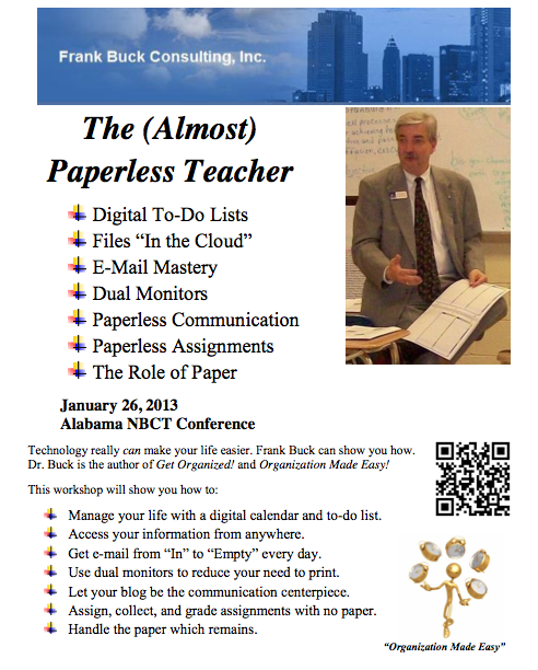 Our annual conference, which will be held at Spain Park High School on January 26, 2012 from 8:00-3:30, will soon be upon us. We are fortunate to have Dr. Frank Buck, the get-organized guru, presenting two different sessions. Here is a preview of one of the sessions that he will be presenting, The (Almost) Paperless Teacher. WE are sure that on one will want to miss the opportunity to learn ways to use digital told effectively and efficiently. Be sure to mark you calendar now.