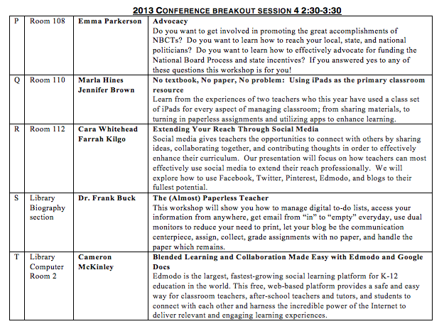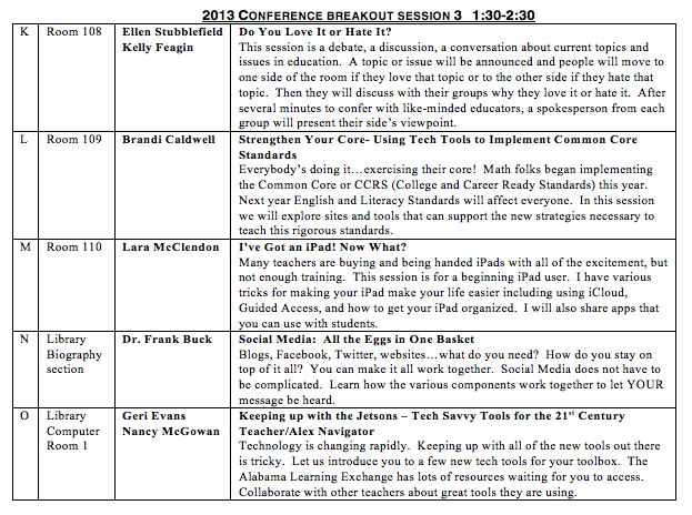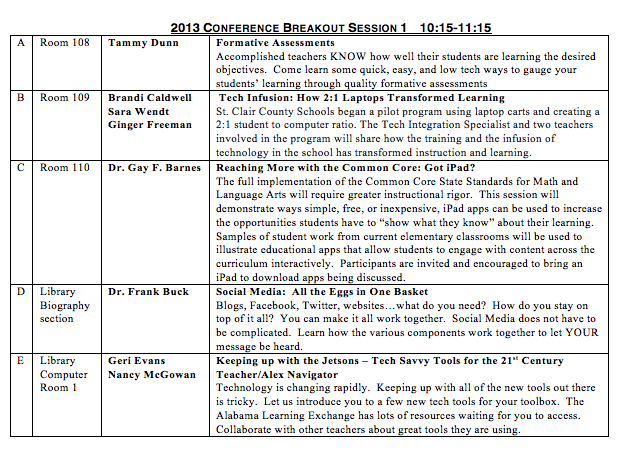 Here they are...the Breakout Sessions for our 2013 Alabama NBCT Network Conference on January 26th at Spain Park High School. This conference is open to ALL educators. Be sure to register soon and bring a colleague or two with you. The deadline for registering via mail is January 22nd. You may register up until the 26th on Eventbrite. We look forward to seeing you there.