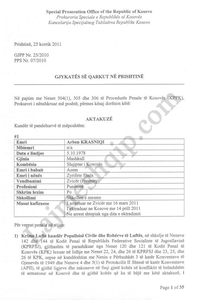 Deputeti i Kuvendit të Kosovës akuzohet për pesë pika, ndër të cilat për krime lufte kundër popullatës civile dhe krime lufte kundër të burgosurve të luftës, shqiptarë dhe serbë ushtarakë, policë dhe civilë.