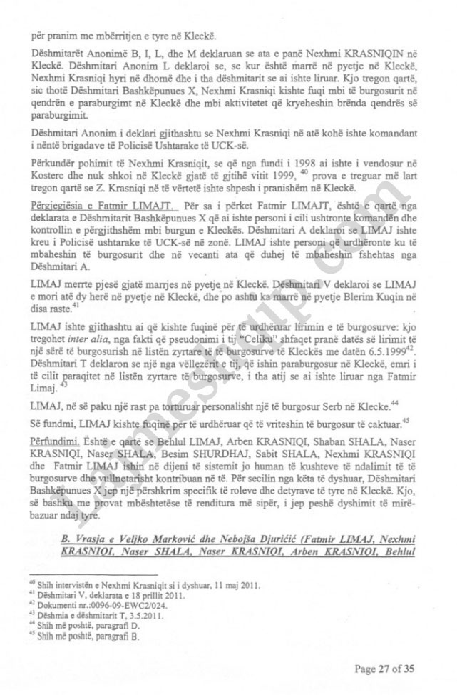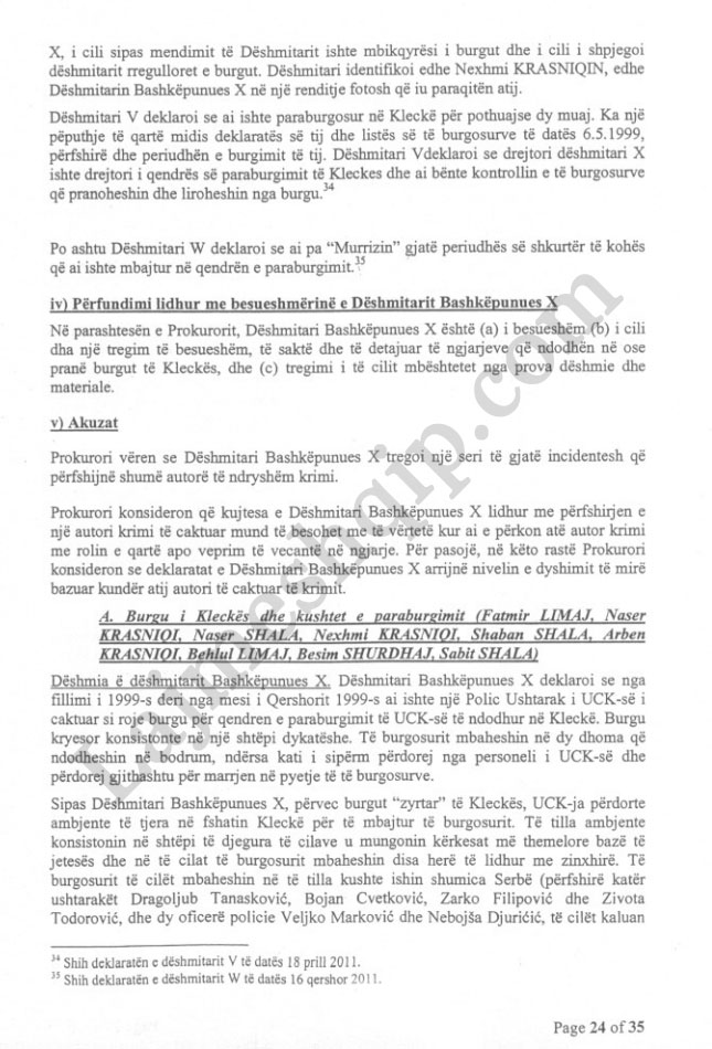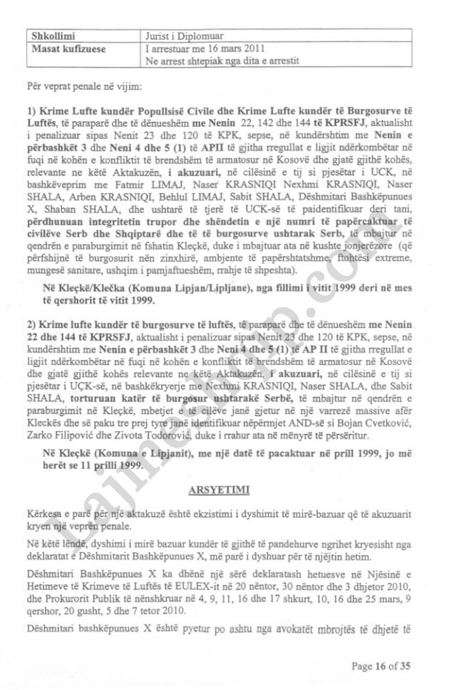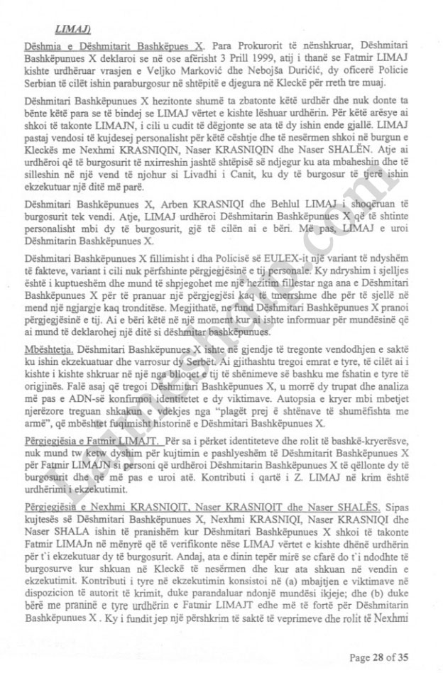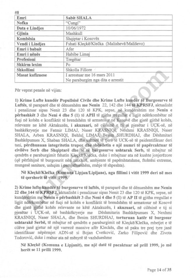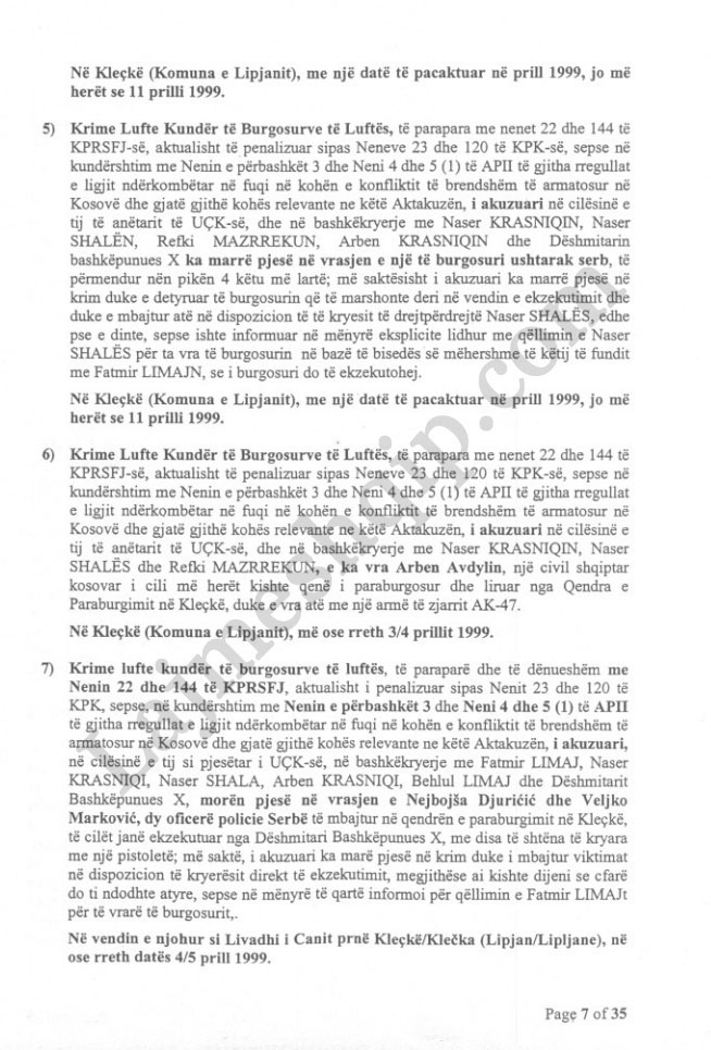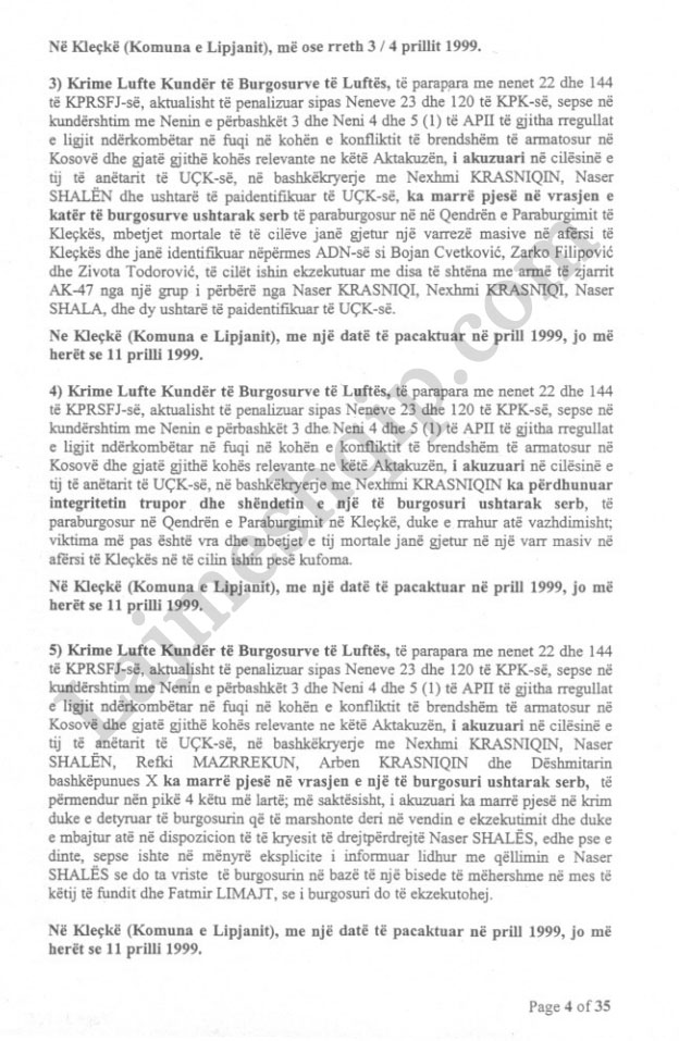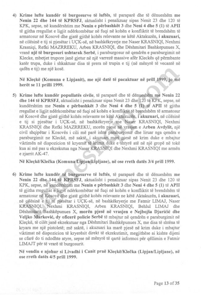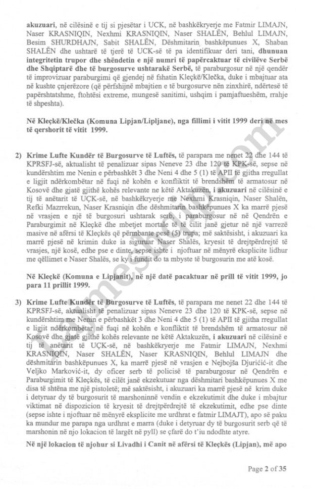 Ata, thuhet në dokument, akuzohen se në bashkëveprim, përfshirë edhe Dëshmitarin X dhe shtatë ushtarë të tjerë të paidentifikuar të UÇK-së, “dhunuan integritetin trupor dhe shëndetin e një numri të papërcaktuar të civilëve serbë dhe shqiptarë dhe të burgosurve ushtarakë serbë, të paraburgosur në një qendër paraburgimi që gjendej në fshatin Kleçkë”.