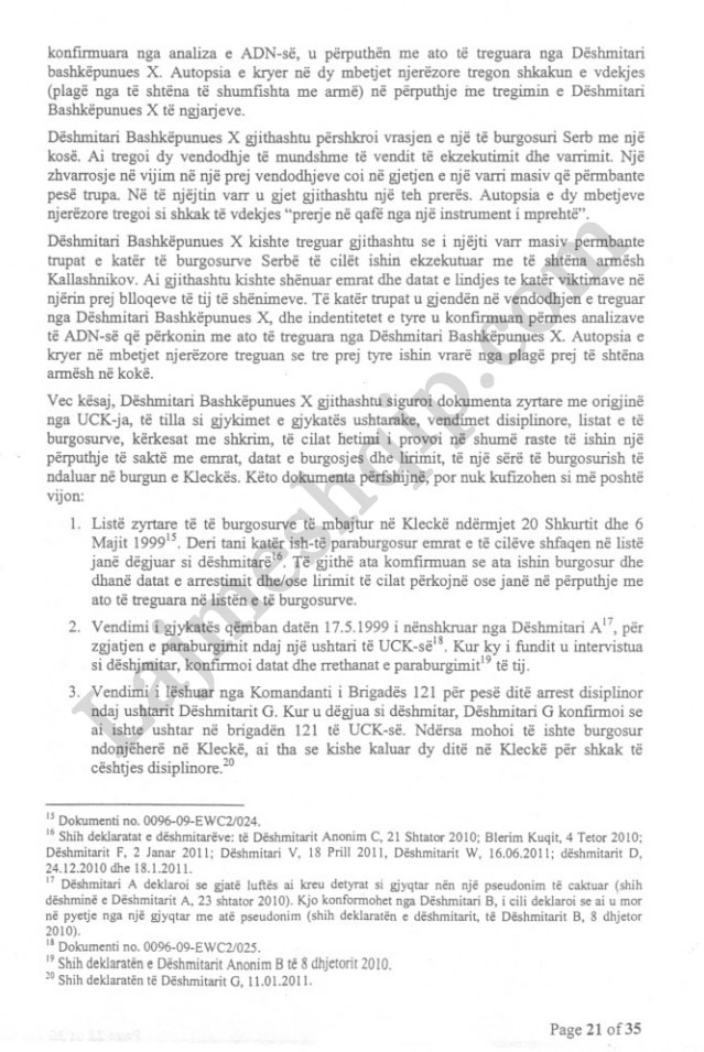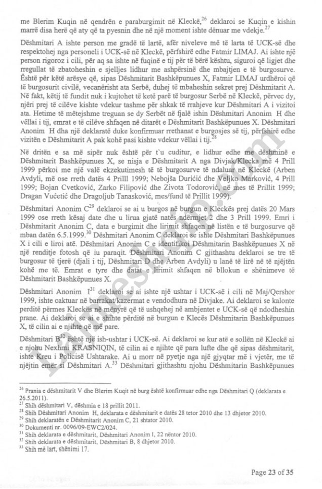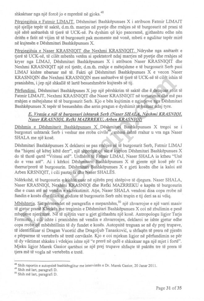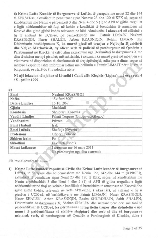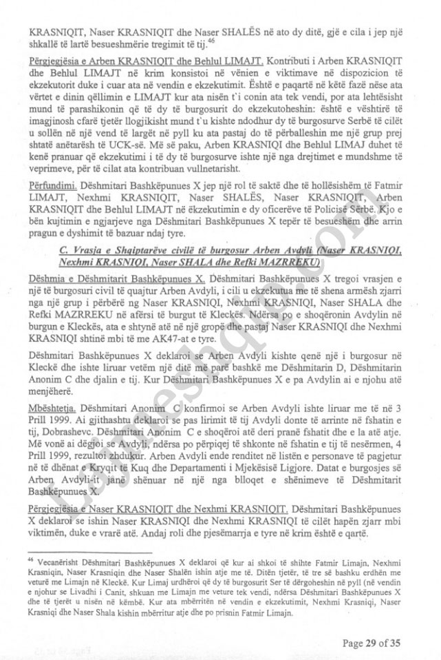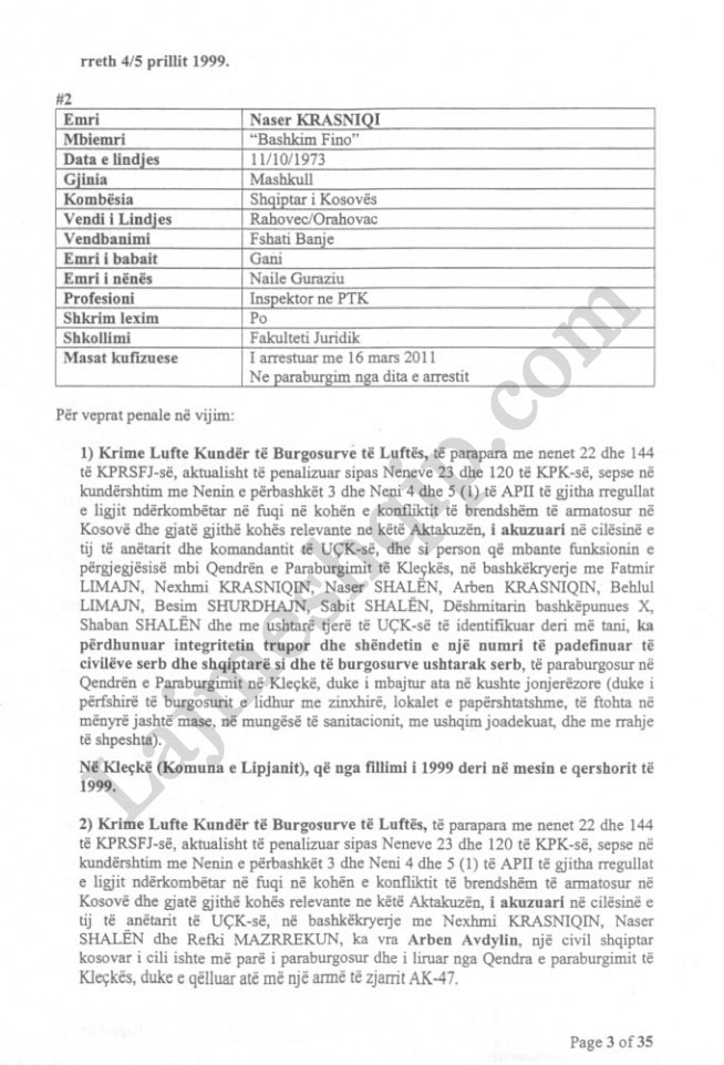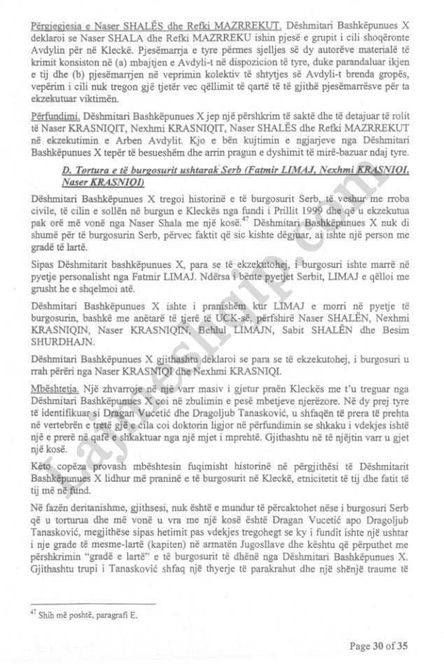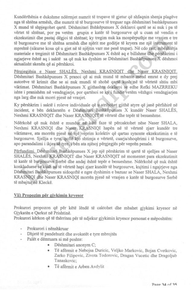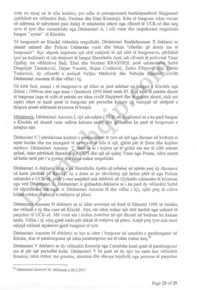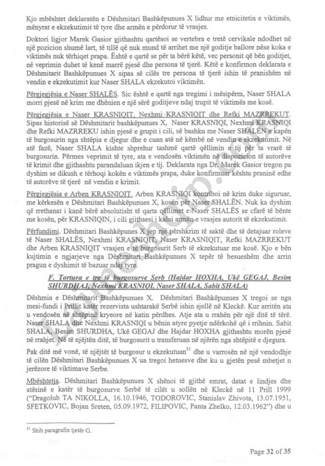 Ata, thuhet në dokument, akuzohen se në bashkëveprim, përfshirë edhe Dëshmitarin X dhe shtatë ushtarë të tjerë të paidentifikuar të UÇK-së, “dhunuan integritetin trupor dhe shëndetin e një numri të papërcaktuar të civilëve serbë dhe shqiptarë dhe të burgosurve ushtarakë serbë, të paraburgosur në një qendër paraburgimi që gjendej në fshatin Kleçkë”.
