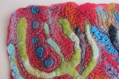 Now..I've also used different colours in a new embroidery. I don't know if it works but I thought I'd give them a go. I made the base with pre-felts on a mixed red/orange/cerise background