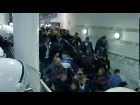 Por, këtë herë policia e shtetit ka vepruar me mençuri, duke e shpejtuar lëvizjen e shkallëve lëvizëse elektrike, duke i quar ‘me zor’ tifozët poshtë shkallëve, duke e evituar kështu përplasjen me ‘armiqtë’ e tyre. /Fish Media/