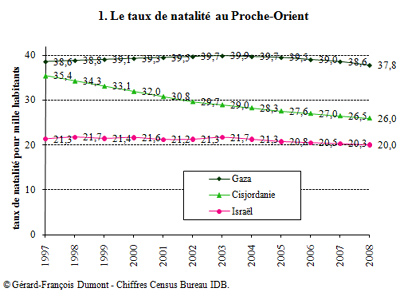 La dynamique démographique de Gaza l’emporte de plus en plus dans la région. Par exemple, en 2008, Gaza compte 56 600 naissances, la Cisjordanie 62 500 et Israël 142 000. Donc, Israël compte plus de naissances que les Territoires palestiniens, mais avec une population supérieure de 80%. Néanmoins, comme le nombre de naissances des Israéliens arabes peut être estimé autour de 25 000, l’ensemble des arabes vivant dans la Palestine mandataire comptent davantage de naissances que les Israéliens non arabes, ce que le Bureau central de statistiques d’Israël dénomme la “ population juive étendue ”, regroupant les Juifs, les Chrétiens non arabes et les individus sans religion déclarée, pour la distinguer de la population arabe vivant en Israël.