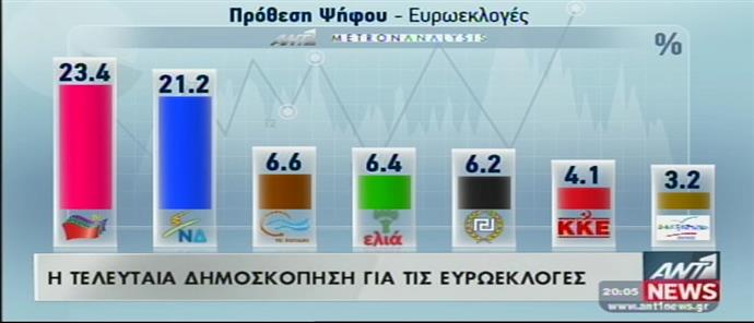 Προβάδισμα 3,6 ποσοστιαίων μονάδων παρουσιάζει ο ΣΥΡΙΖΑ έναντι της ΝΔ στην πρόθεση ψήφου για τις ευρωεκλογές, σύμφωνα με πανελλαδική δημοσκόπηση (20-22 Μαΐου) της εταιρείας «Marc» για λογαριασμό της τηλεόρασης του Alpha.