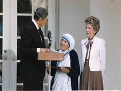Ish Presidenti i Shteteve të Bashkuara Ronald Reagan duke e shpërblyer Nënë Terezën me çmimin Medal of Freedom 1985