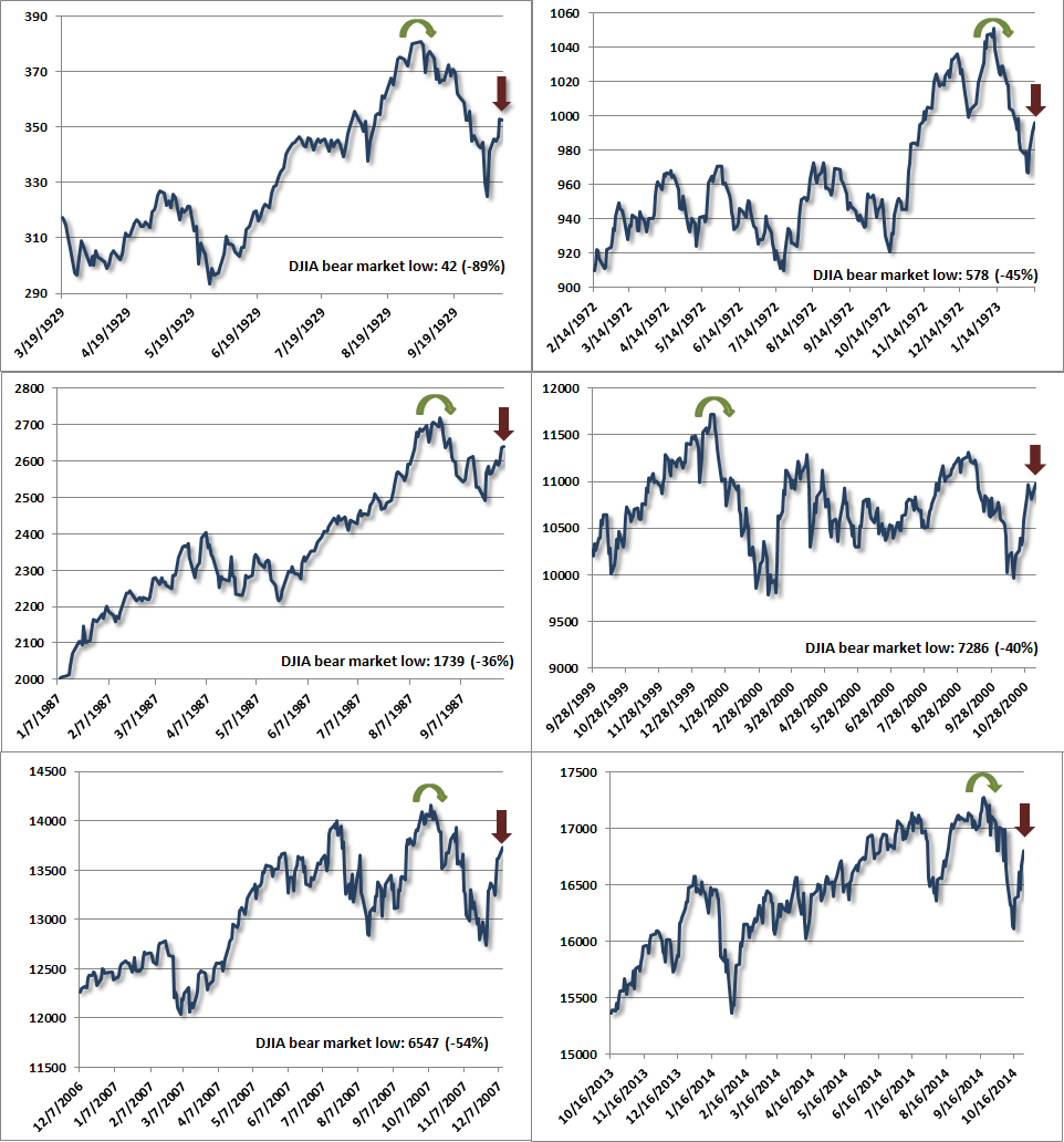 My impression is that we are observing a similar dynamic at present. Though we remain open to the potential for market internals to improve convincingly enough to at least defer our immediate concerns about market risk, we should also be mindful of the sequence common to the 1929, 1972, 1987, 2000 and 2007 episodes: 1) an extreme syndrome of overvalued, overbought, overbullish conditions (rich valuations, lopsided bullish sentiment, uncorrected and overextended short-term action); 2) a subtle breakdown in market internals across a broad range of stocks, industries, and security types; 3) an initial “air-pocket” type selloff to an oversold short-term low; 4) a “fast, furious, prone-to-failure” short squeeze to clear the oversold condition; 5) a continued pairing of rich valuations and dispersion in market internals, resulting in a continuation to a crash or a prolonged bear market decline.