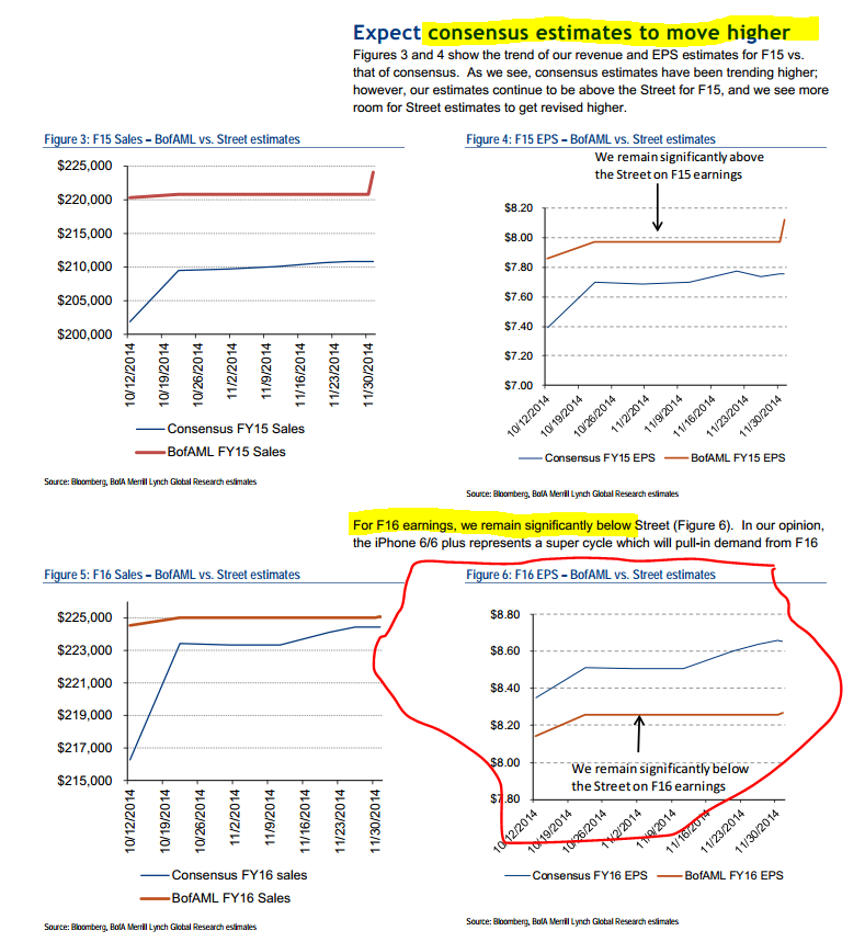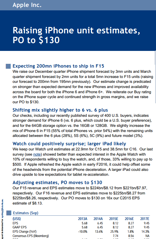 1. No explanation for why the key metric (iPhones) is increased by 2.5% and EPS next year only by 0.1% (the reason is that the iPhone 6 is expected to only have short term effects and thus shouldn't affect EPS, valuation or target price)