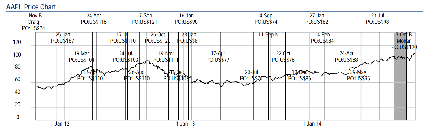 Earlier in the day, Bank of America Merrill Lynch released a new research report on the company (just 15 pages). In it Merrill's analyst upgraded his price objective to 130 USD per share from 120, based mainly on his increased estimate for iPhone unit sales estimate in Fiscal Year 2015 from 195 million to 200 million, i.e., by 2.5%.