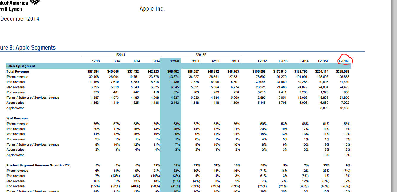 It's bad enough, albeit pragmatic in today's environment, to base price objectives and recommendations on P/E ratios. What's worse is that the target price is based on the 12 month forward (Calendar 2015) EPS which is extremely heavily affected by the launch of the iPhone 6. In addition the reader only gets to see forecasts up until FY 2016 and is supposed to for an investment strategy on 2 years of forecasts in a market with a duration of 50 years: