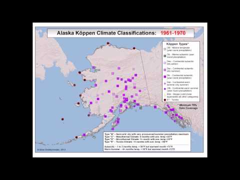 This YouTube video shows the results of the analysis for each 10-year period. The 5 major Köppen types are represented by different colors (of course there are no Tropical climates in Alaska). The minor Köppen subcategories are represented by different shapes and shades of the major category color. Early time periods have relatively few stations meeting the selection criteria, so spatially meaningful analysis is limited. To view the video clearly, expand it into full screen mode and make sure the resolution is set to 1080p HD from the settings (gear-shaped) button. This is the only way to read the text in the legend.