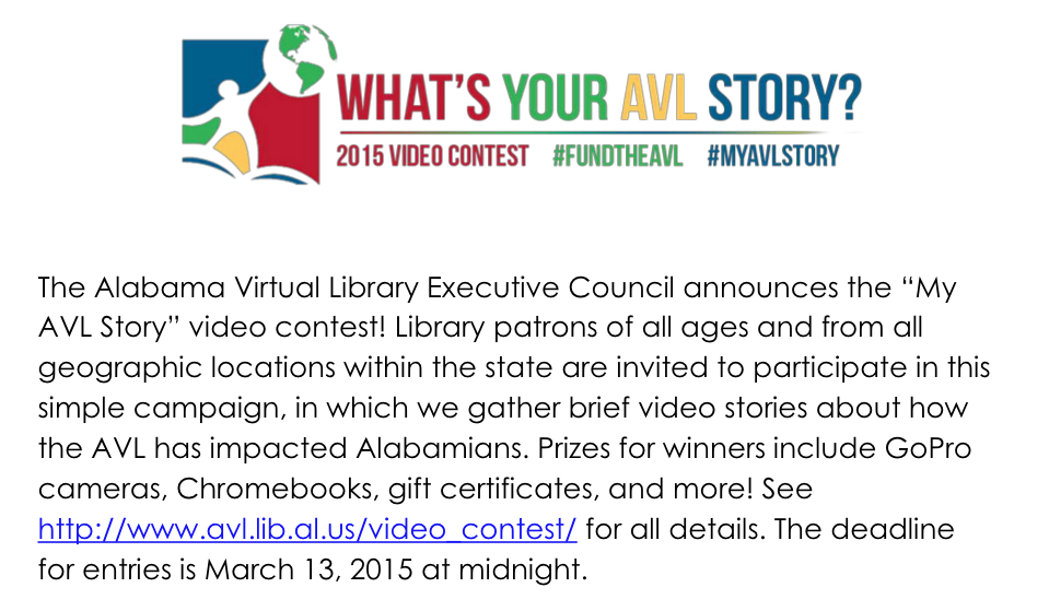 The Alabama NBCT Network believes in promoting the accomplishments of Alabama's students and teachers. The Alabama Virtual Library Video Contest is a fantastic way for Alabama NBCTs and their students to shine.