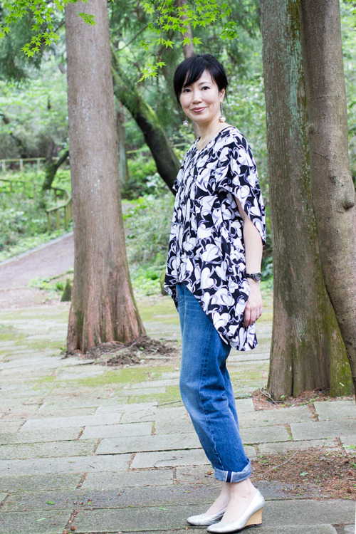 I used a lightweight polyester. I love the this top with slouchy high-low hem and unique sleeves.