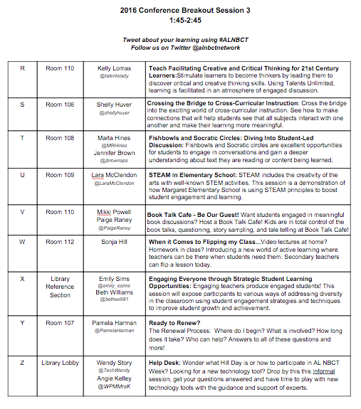 Below you will find the Breakout Session schedule for our 12th Annual Alabama NBCT Network Conference. As you can see, this day will be packed with fantastic professional learning, connecting, and networking. It's a day that you do not want to miss. Learning is more fun together, so invite your friends and colleagues. Our conference is open to all educators and preservice teachers. Be sure to register soon to get the Early Bird Rate. http://2016alnbct.eventbrite.com