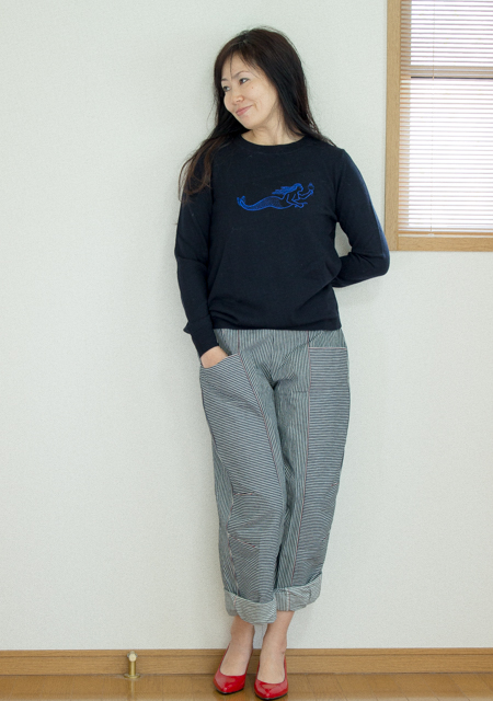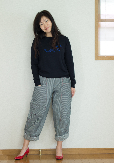 I changed the cutting layouts and placed the side-front piece (:Pocket) on the fabric vertically. I love the hickory stripe with red stitching. I'll wear them around the house:) I would to sew them again, maybe with linen(Marcy Tilton com).