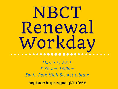 Are you an NBCT currently pursuing renewal? This day is for you! This event is designed as a workday where those pursuing renewal can work alongside others who are renewing while benefitting from the informal support of those who have recently achieved renewal. This is an informal workday where writing can be done, feedback received, ideas shared, entries read, and questions answered. Register here: https://goo.gl/Z1f86E