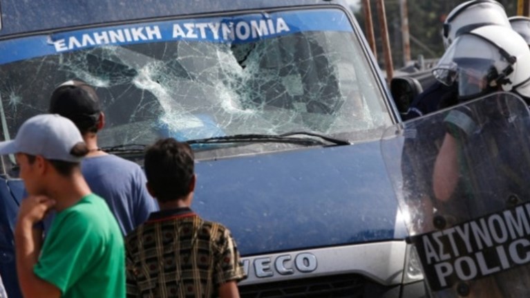 από κλούβα της αστυνομίας την ώρα που εκτελώντας εργασίες εξωτερικά της σκηνής του, έχασε την ισορροπία του και έπεσε στο έδαφος. το γεγονός είχε προκαλέσει «έκρηξη» των προσφύγων που επιτέθηκαν με πέτρες εναντίον αστυνομικών οχημάτων.