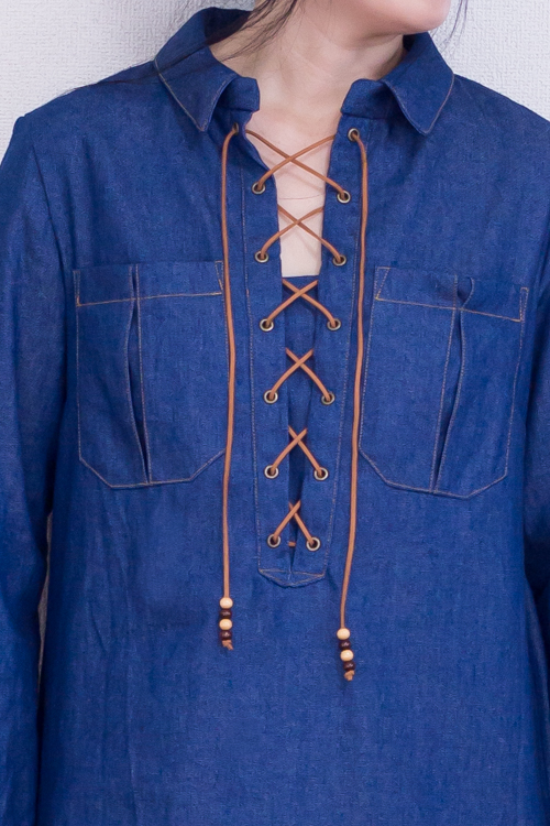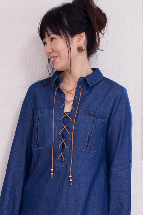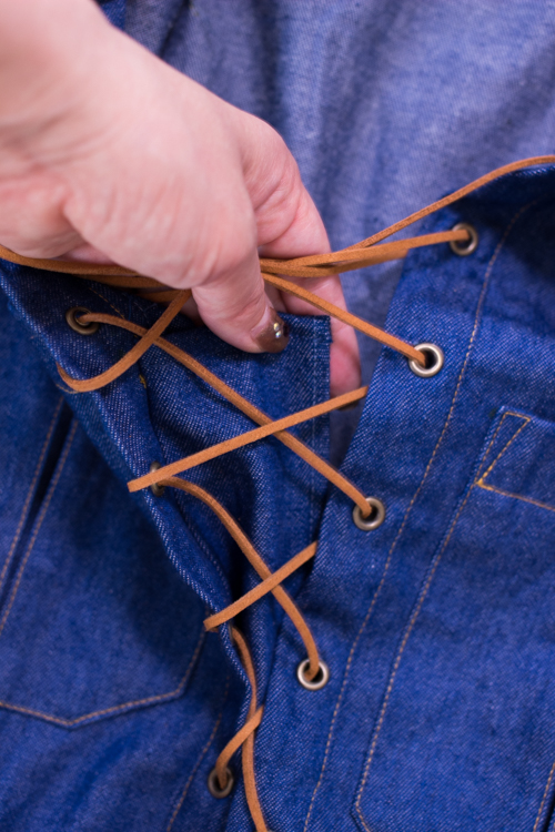 I changed the chest pockets design, skirt hemline and front tab...etc. I decorated with the camel stitch using a double needle. In order to highlight the laced-up front, I made it wider and longer than a conventional front. I extend the laced-up front to my upper navel. I thought the bigger laced-up front looks more casual than the normal design.